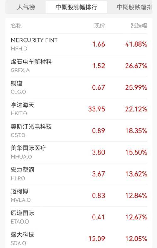 热门中概股普遍上涨。MERCURITY FINT 涨41.88%,烯石电车新材料涨26.67%,铜道涨25.99%领涨中概股。亨达海天涨22.12%,盛大科技涨12.05%,盛美半导体涨11.83%,满帮集团涨11.46%,比特数字涨8.68%,世纪互联涨8.64%,高途集团涨5.89%,嘉楠科技涨4.93%,万国数据涨4.91%。