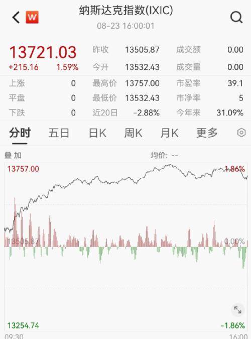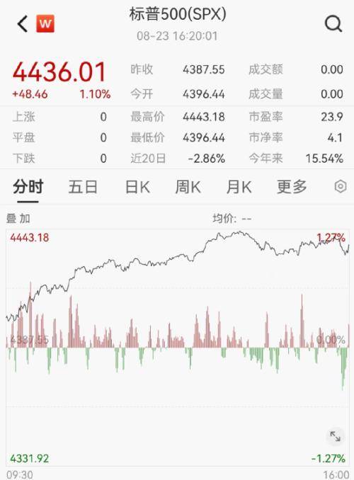 美东时间8月23日,美国三大股指全线收涨。截至收盘,道指涨0.54%报34472.98点,标普500指数涨1.1%报4436.01点,纳指涨1.59%报13721.03点。默克涨3.83%,英特尔涨3.31%,领涨道指。万得美国TAMAMA科技指数涨1.98%,英伟达涨3.17%,特斯拉涨1.57%。