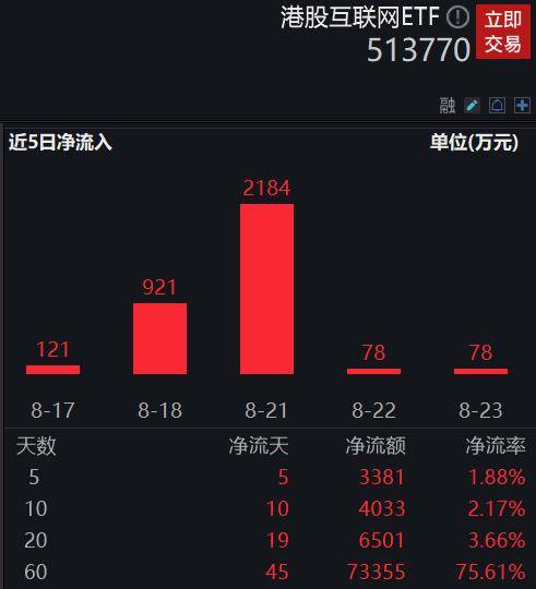 伴随南向资金持续买入,港股类ETF份额也是“水涨船高”。以港股互联网ETF(513770)为例,数据显示,该ETF已经连续13日净申购,区间累计净申购额超4400万元;拉长维度看,近60日港股互联网ETF(513770)累计净流额高达7.34亿元。