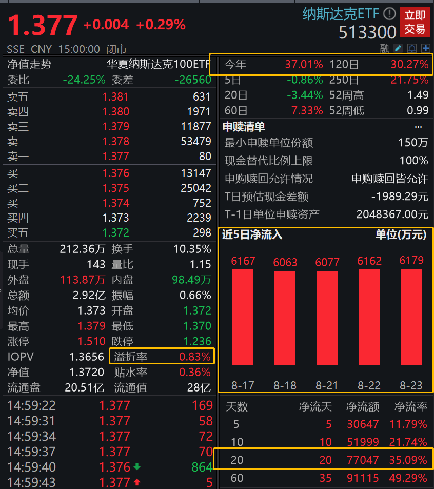 海外市场火热,QDII基金受青睐至今,人工智能浪潮下,美股科技行情值得期待。截至8月23日,纳斯达克ETF(513300)近20个交易日获得资金持续净申购,金额超过7.7亿元。资料显示,纳斯达克ETF(513300)跟踪纳斯达克100指数,优选市值前100的非金融公司,英伟达、微软、苹果、亚马逊、特斯拉、谷歌等科技龙头均是ETF重仓股。