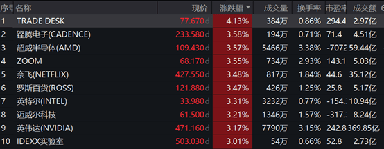 该基金紧密跟踪纳斯达克100指数(NDX.GI),指数隔夜收涨1.6%。成份股中,TRADE DESK上涨4.13%,铿腾电子上涨3.58%,超威半导体、英伟达等个股跟涨超3%。