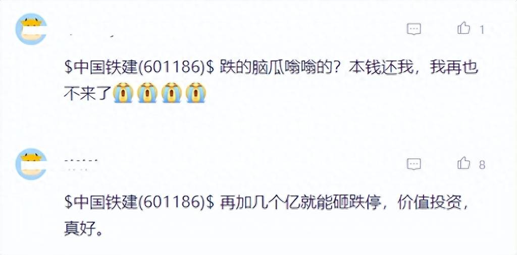 针对中国铁建异动的股价表现,引起了投资者的热议。在网上,有股民写道:“跌的脑瓜嗡嗡的?本钱还我,我再也不来了”!