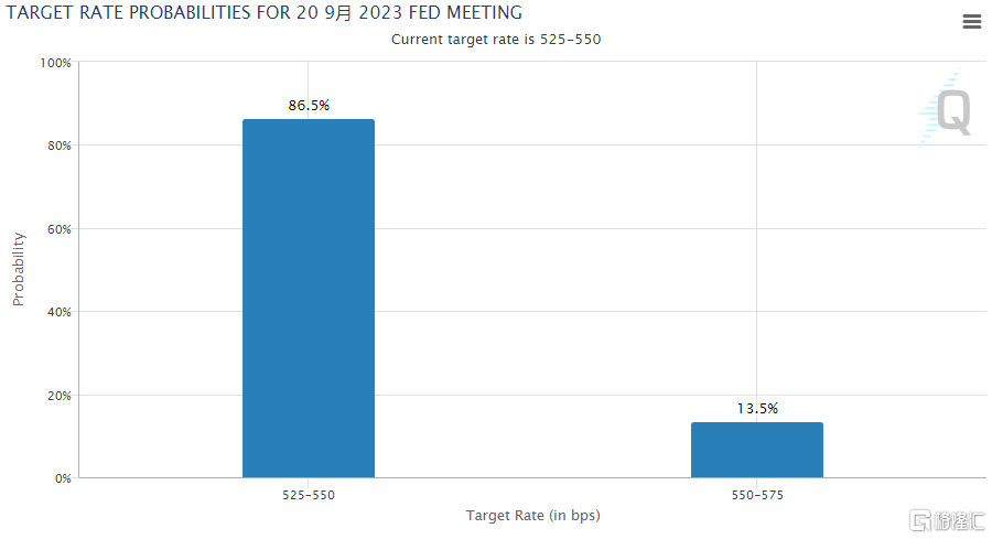 根据CME的FedWatch工具显示,美联储在9月会议上维持利率不变的概率目前为86.5%。