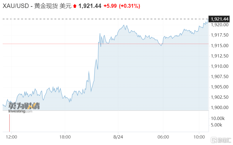 金价也大幅走高。受美国国债收益率和美元回落的提振,昨天金价自昨天开始大涨,日盘中一度触及1920关口,收报1915美元附近,创下了一个多月来的最大单日涨幅。今天金价继续大幅走高,现报1921.44。