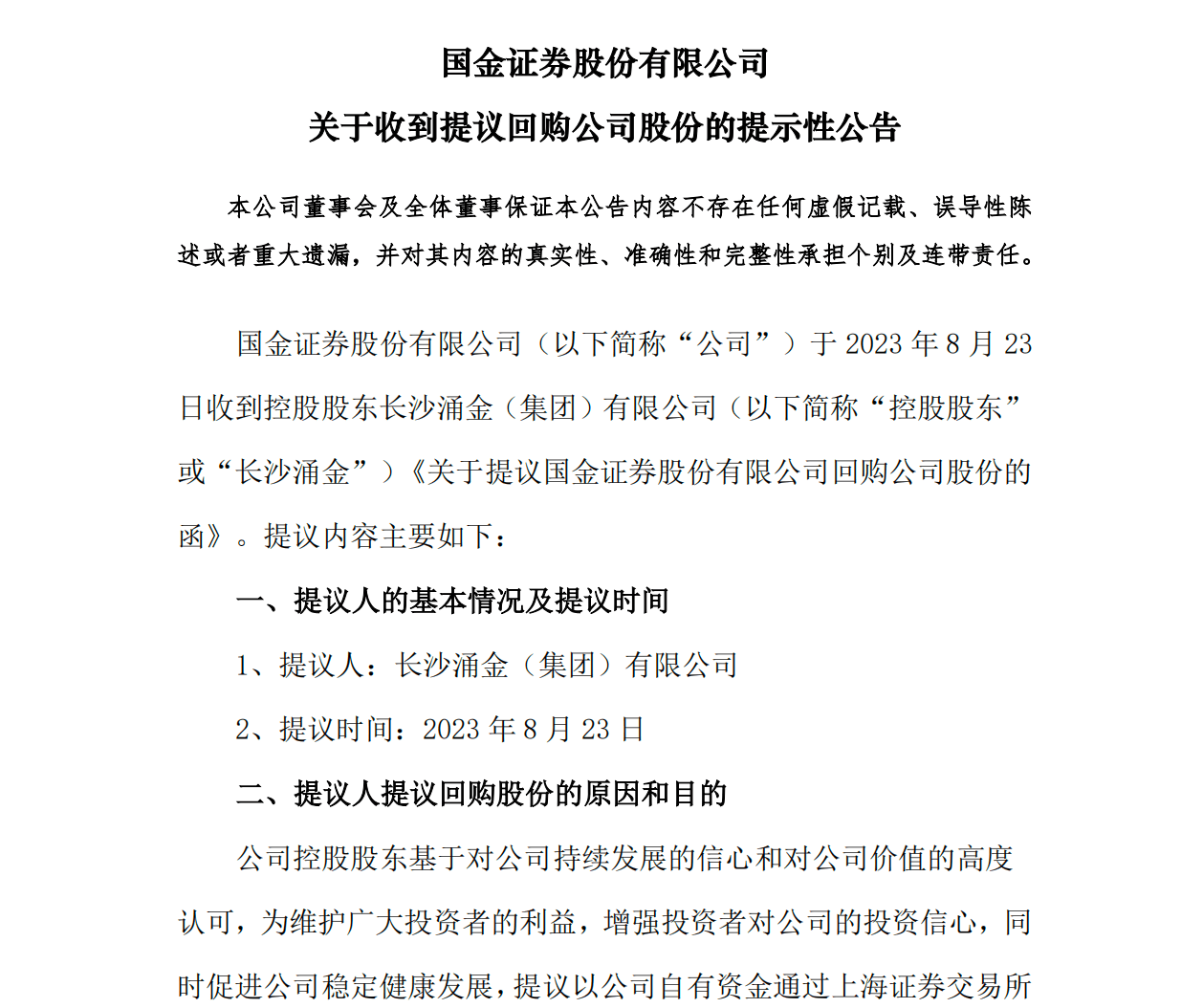 8月23日,国金证券公告,控股股东长沙涌金提议以公司自有资金回购公司股份。