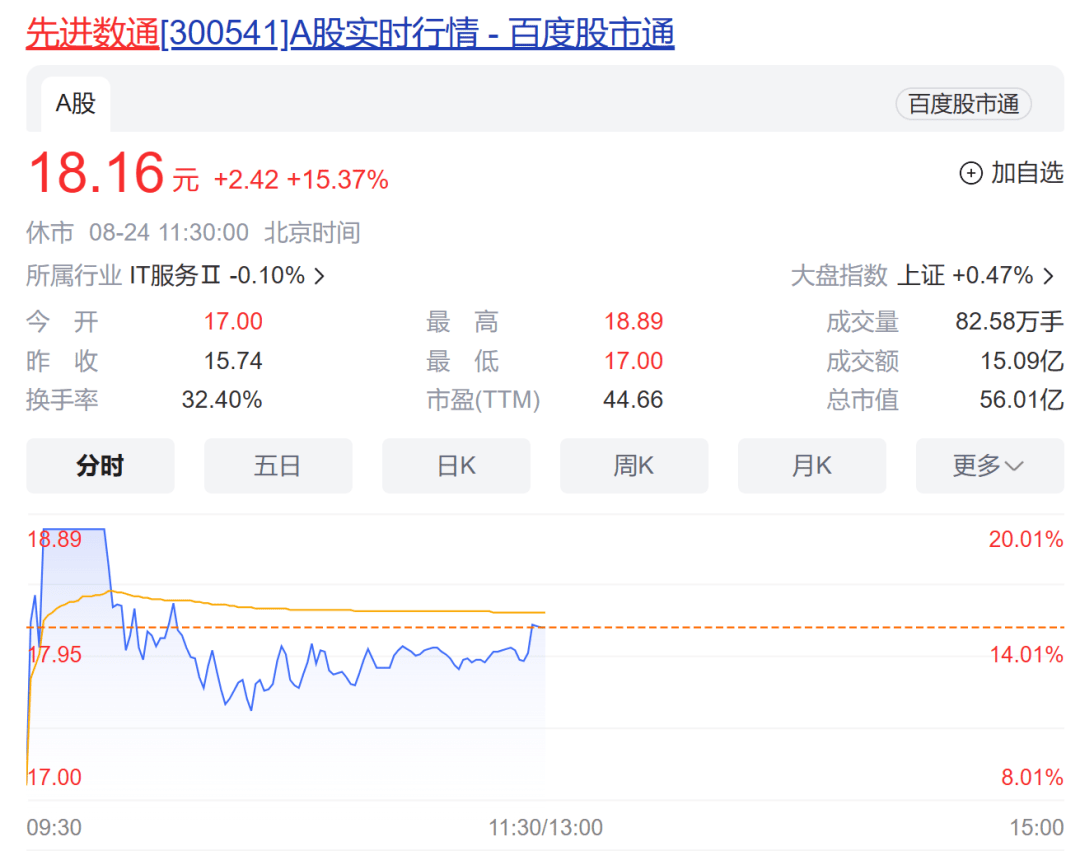 8月24日上午,先进数通开盘后股价迅速走高,实现20CM涨停。除先进数通外,中富通、鸿博股份、工业富联、沪电股份等早间均有明显涨幅。