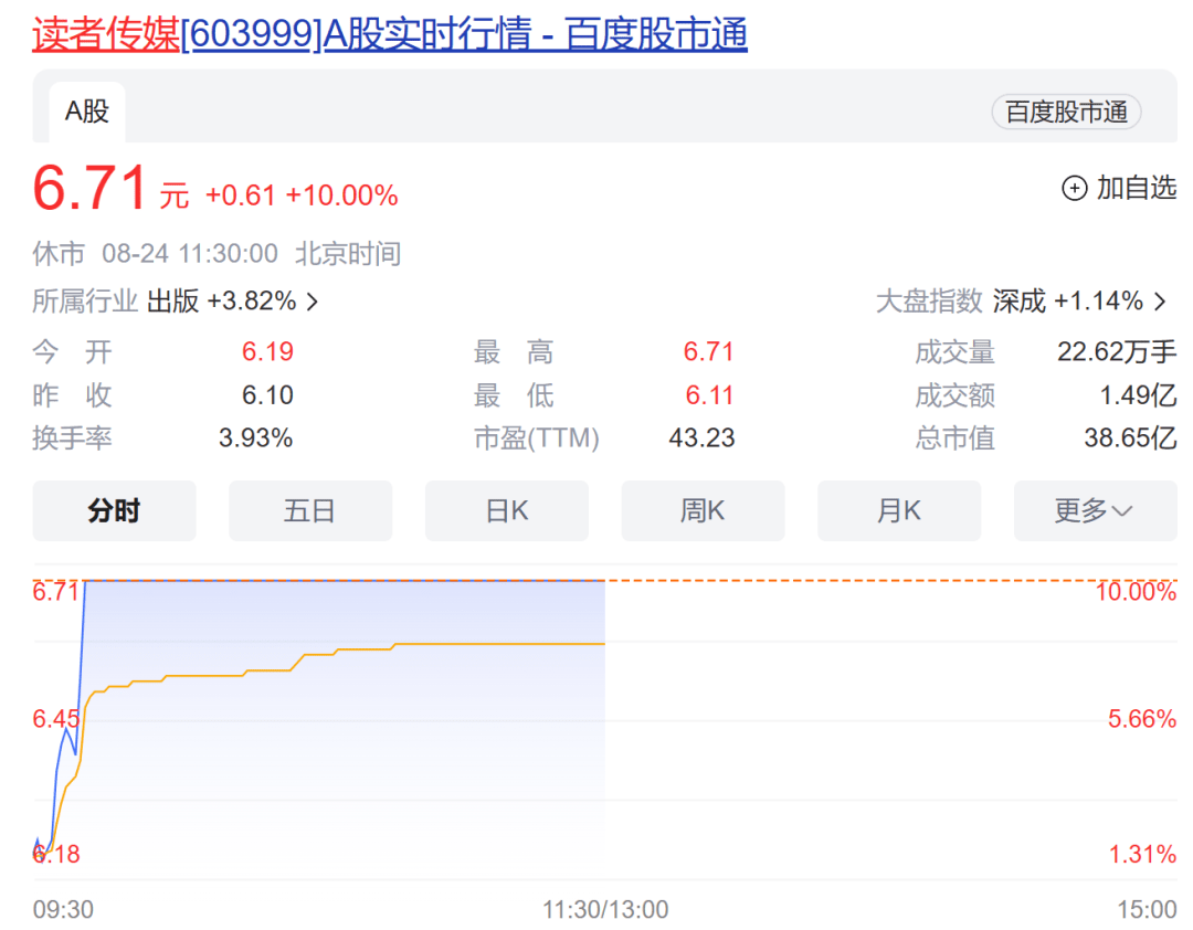 知识付费概念股早盘异动频频,板块指数一度放量拉升超3%,半日成交接近昨日全天成交。读者传媒开盘不到10分钟就直线封涨停,中国出版亦强势涨停,南方传媒、出版传媒等纷纷强势上攻。