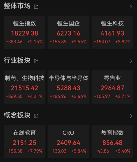板块方面,港股制药、半导体、零售业等板块领涨。