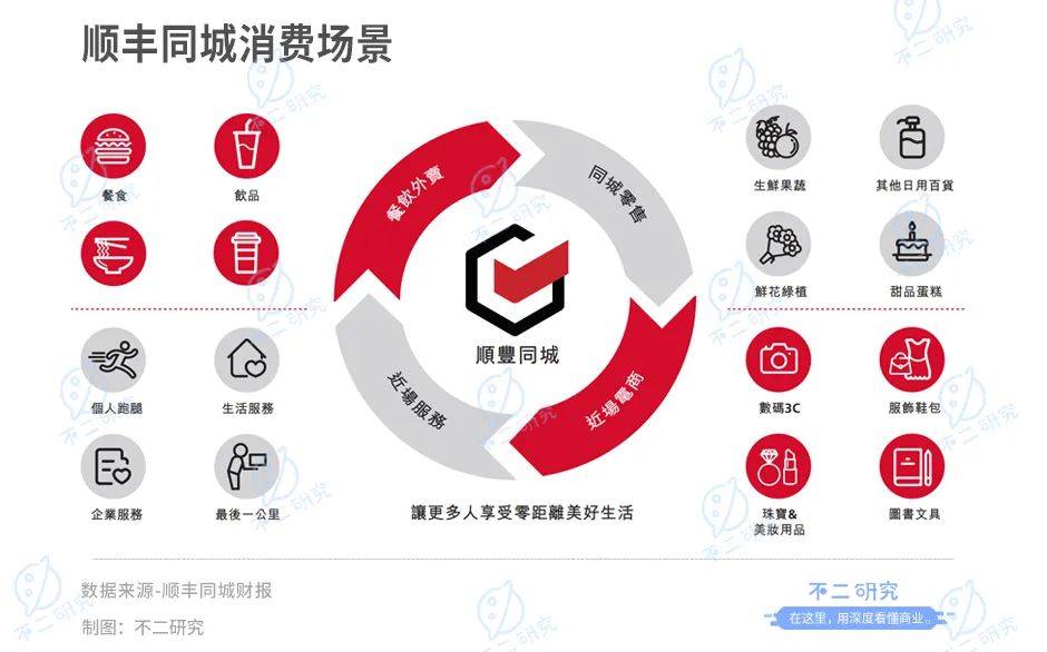 顺丰同城在财报中将即时配送未来的消费场景分为了四类,分别为餐饮外卖,同城零售,近场电商,进场服务。
