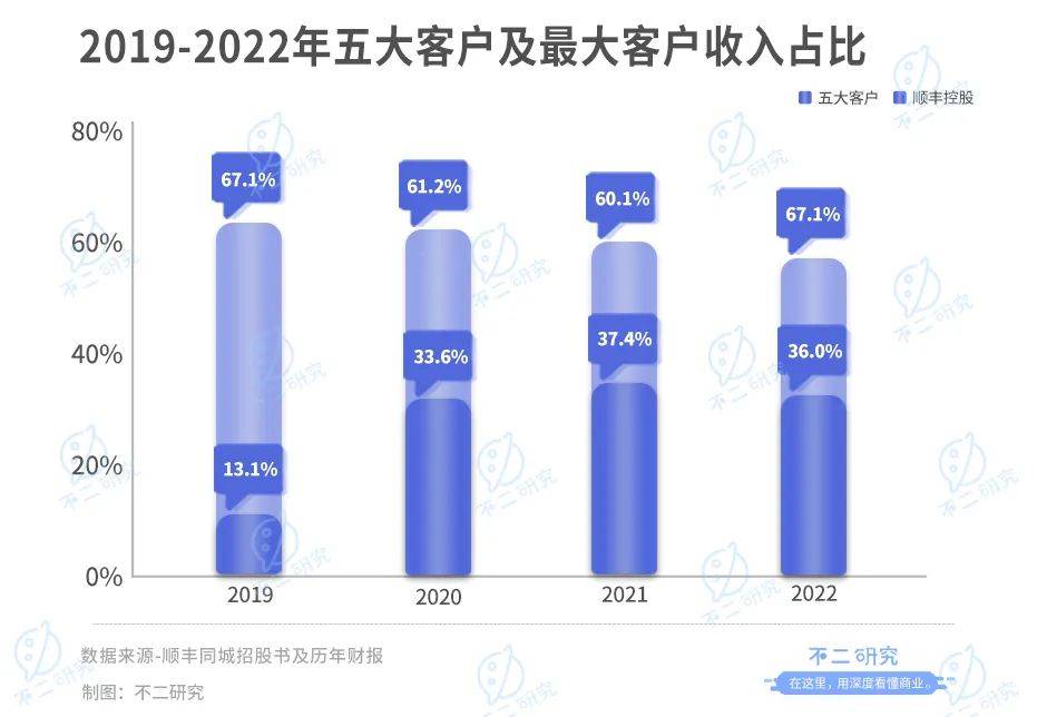 据其招股书及财报显示,顺丰同城2019-2022年来自前五大客户的收入占比分别为67.1%、61.2%、60.1%、59.1%。其中,同期来自顺丰控股的收入占比分别为13.1%、33.6%、37.4%和36.0%。