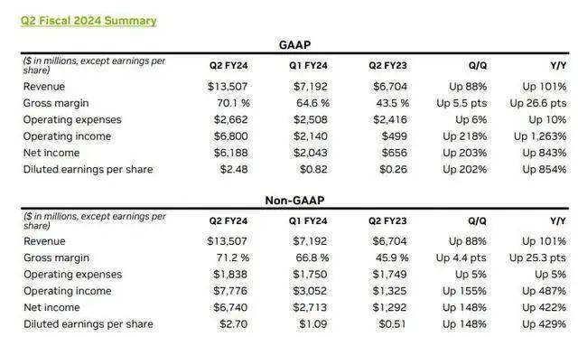作为全球人工智能算力“军火商”,英伟达公布了强于预期的新一期业绩,盈利同比增长超8倍,并就美国升级对中国人工智能管控的影响进行回应。8月24日英伟达公布的2024第二财报季业绩显示,截至2023年7月30日公司第二季度收入135.1亿美元,同比增长101%,比上一季度增长88%,高于分析师预期110.4亿美元;归属净利润实现61.88亿美元,同比增长8.43倍;摊薄每股收益为2.48美元,同比上年同期增长854%,环比上一季度增长202%。