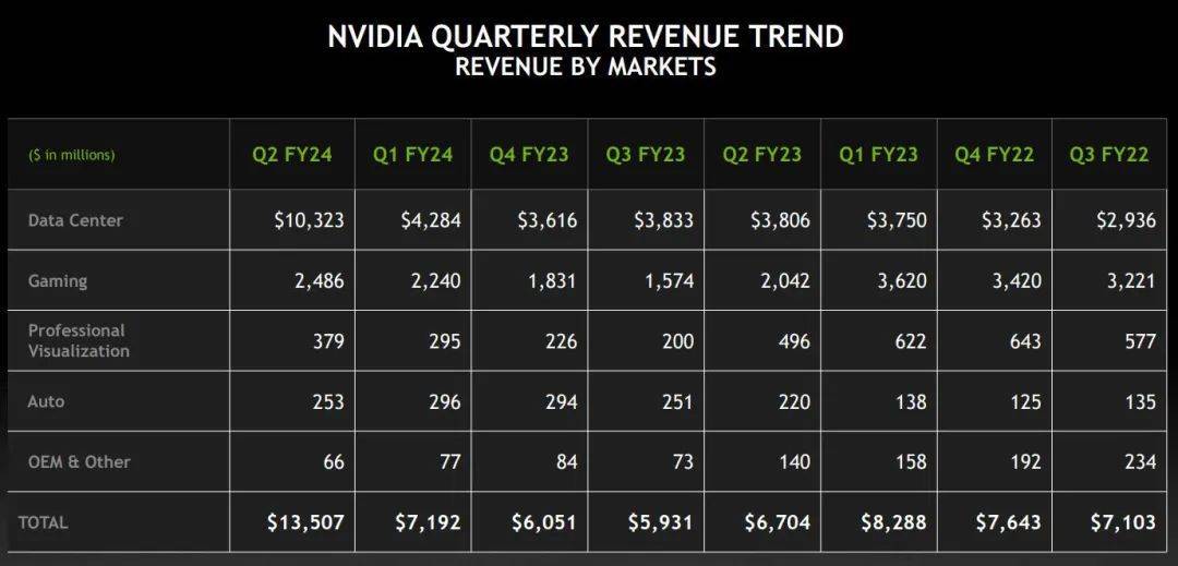 据介绍,用于复杂人工智能和高性能计算的 GH200 Grace™ Hopper™ 超级芯片在第二季度正在交货,预计配置HBM3e的第二代版本将在2024年第二季度发货。本季度英伟达还发布了服务器MGX ™,可以为人工智能、高性能计算和NVIDIA Omniverse,实现100多种服务器应用程序高效、快速运行。另外,英伟达与亚马逊、 微软 Azure和其他云服务提供商推出基于NVIDIA H100 Tensor Core GPU 的云应用案例,公司也与埃森哲、VMware 、Snowflake 、软银等合作伙伴开展一系列人工智能合作。相比强劲数据中心业务,英伟达的游戏业务也获得提振,第二季度实现收入24.9亿美元,同比增长22%;不过,专业可视化业务第二季度的收入为3.79亿美元,同比下降24%;汽车业务第二季度营收为2.53亿美元,环比下降15%,同比增长15%。期间,英伟达与联发科达成合作,使用英伟达GPU来为全球OEM厂商提供主流自动驾驶汽车系统。