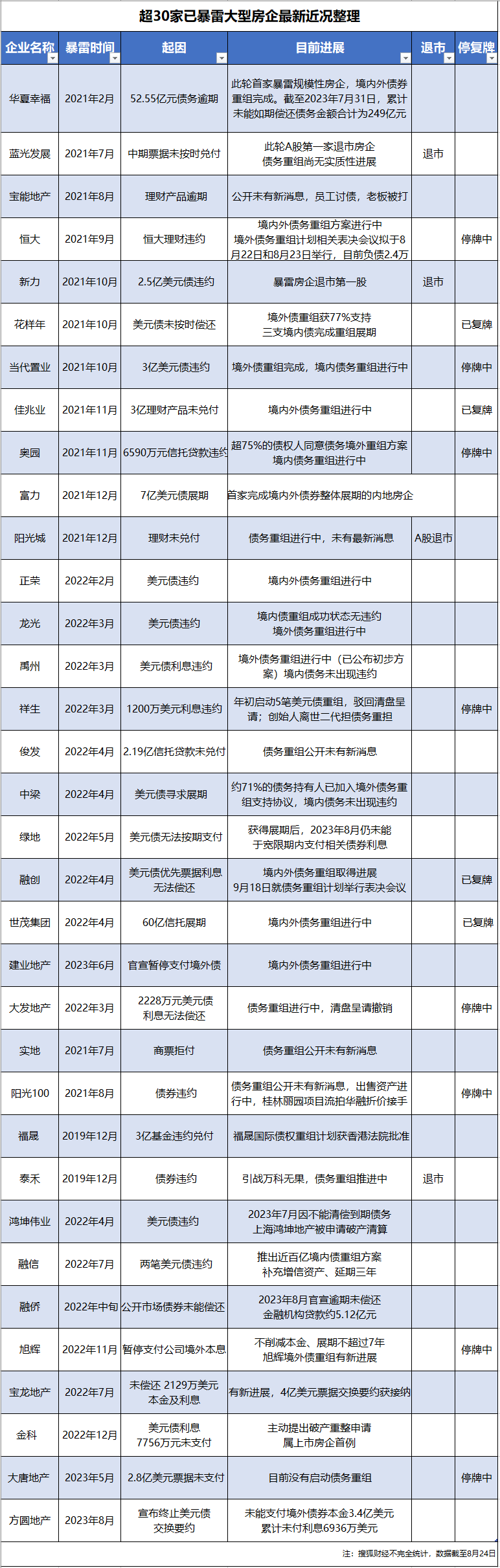 8月23日,粤系老牌房企方圆地产宣布终止美元债交换要约,成为此轮新一家暴雷房企。据搜狐财经不完全统计,截至2023年8月24日,除在暴雷边缘被“拉回”的碧桂园及远洋,目前已经有超过30家大型房地产企业暴雷。暴雷时间从2021年初至今不等。
