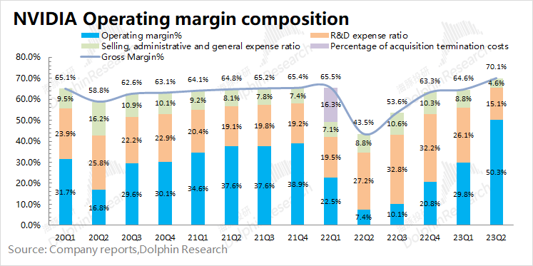 2024财年第二季度英伟达营业利润率回升至50.3%,向合理区间靠拢。本季度营业利润率的回升,主要是受毛利率上升和费用率的下降的双重影响。
