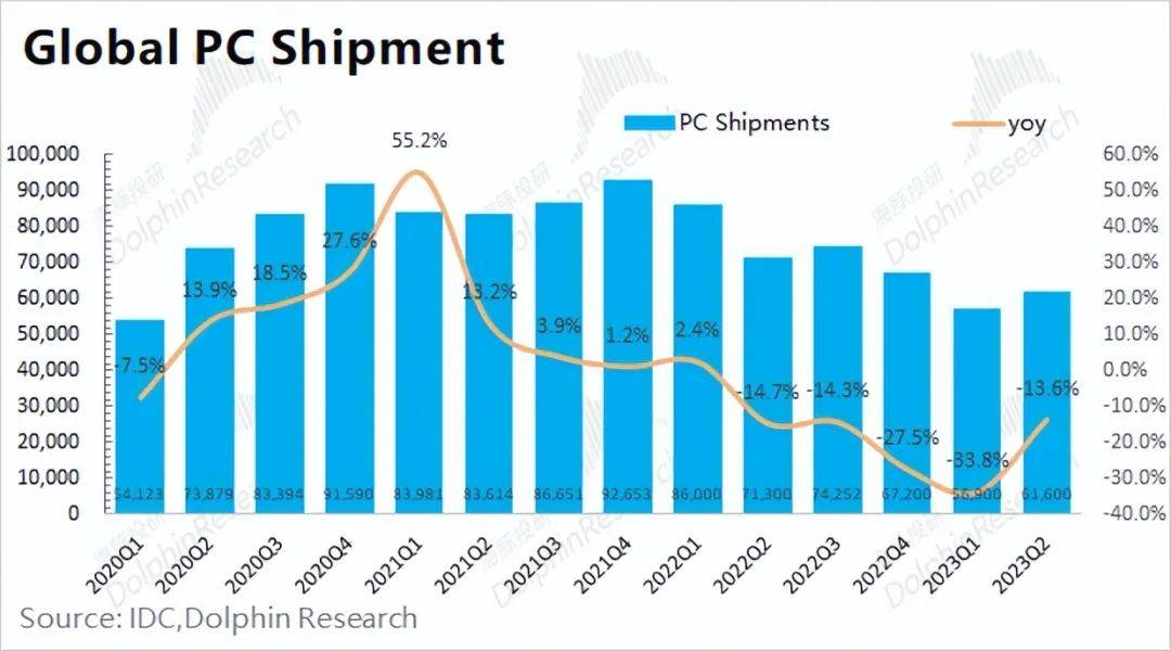 全球PC市场在二季度有所回暖,同比下滑幅度有所收窄。根据IDC最新的数据,2023年二季度全球PC市场出货为6160万台,同比下滑近13.6%。虽然仍有下滑,但跌幅好于前两个季度,这主要是当前PC市场补库需求开始回升;