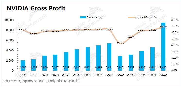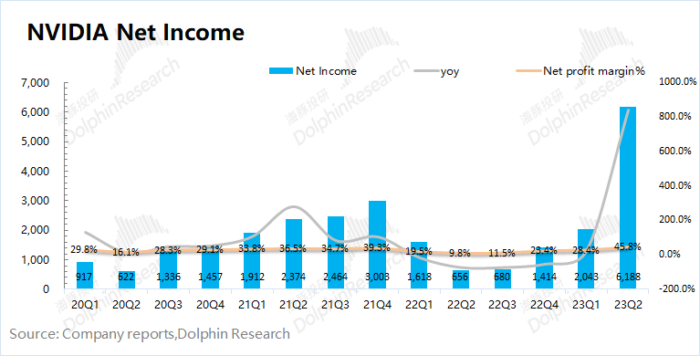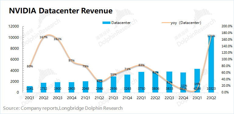 对于三季度如此超预期的指引,海豚君认为PC和游戏业务开始迎来回暖,而其中主要超预期仍是来自于AI和大语言模型方面激增的需求。在美国大多数科技股二季度交出相对疲软数据的情况下,英伟达呈现出“一家独赢”的局面。这展现出市场对数据中心业务依然有着强烈的需求,而英伟达在市场中具有绝对领先优势。