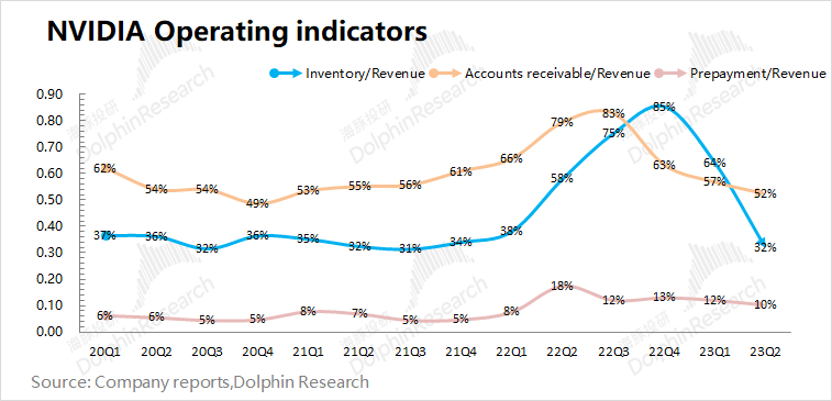 3、主要财务指标:费用率进入历史低位。英伟达本季度经营费用率下滑至20%以下的历史低位。这主要是由于收入端的暴增,使得费用端的占比明显减小。而在存货端已经明显好转,公司本季存货继续减少近3亿美元,存货指标开始走向“供不应求”。