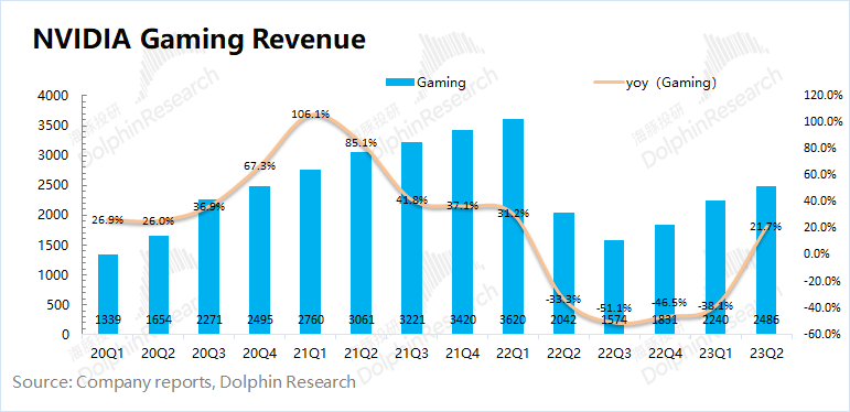 1)本季度游戏业务同比增长21.7%,继续呈现回暖态势。海豚君认为公司本季度游戏业务回暖的主要原因是:a)PC市场存在一定的补库需求,一定程度上也增加了对GPU的需求;b)本季度AMD的游戏业务环比回落,而英伟达继续回升,当前市场对英伟达独显需求相对较好;
