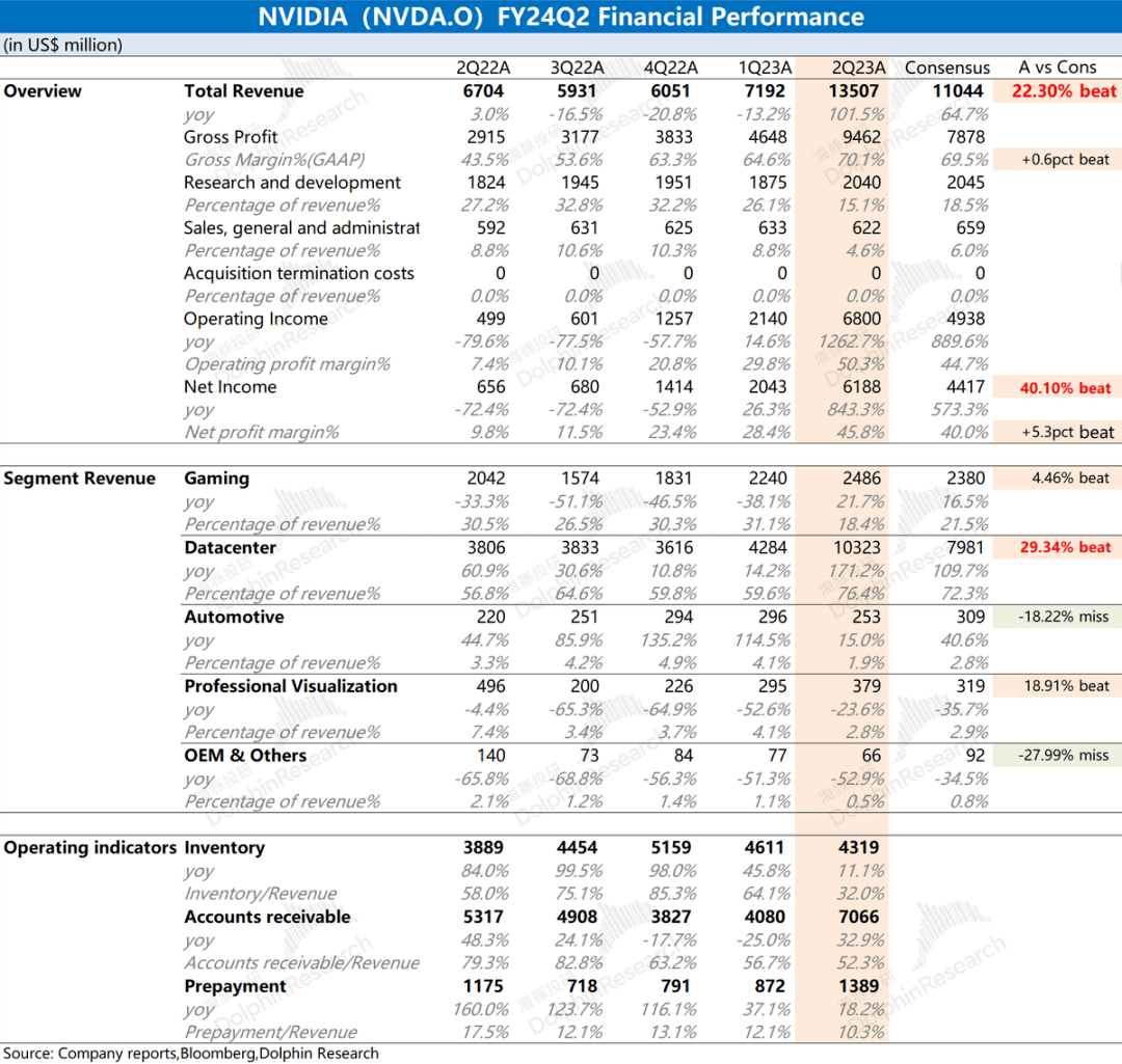 4、下季度指引:英伟达预计第三季度收入160亿美元(正负2%),同比增长170%,大超市场预期125亿美元;三季度毛利率71.5%(正负0.5%),也超市场预期69.95%,再创历史新高。