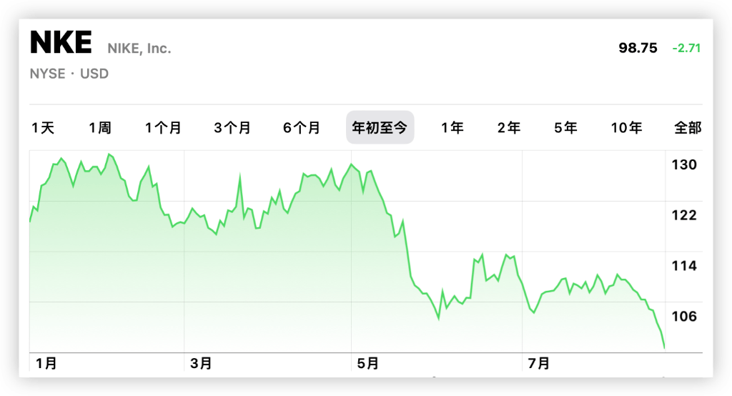 今年迄今,耐克的股价已下跌超过13%,与大盘指数则上涨14%的走势截然相反。