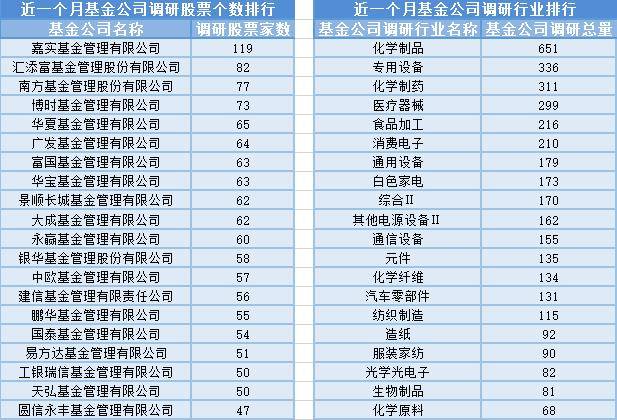 近一个月(7月24日-8月24日),嘉实基金参与公司调研的数量最多,共调研119家上市公司,然后调研较为活跃的还有汇添富基金、南方基金和博时基金,分别调研82家、77家、73家上市公司;从调研行业上来看,基金公司对化学制品行业的上市公司调研次数最多,共有651次,其次是专用设备行业,基金公司调研了336次。