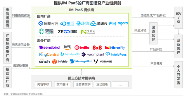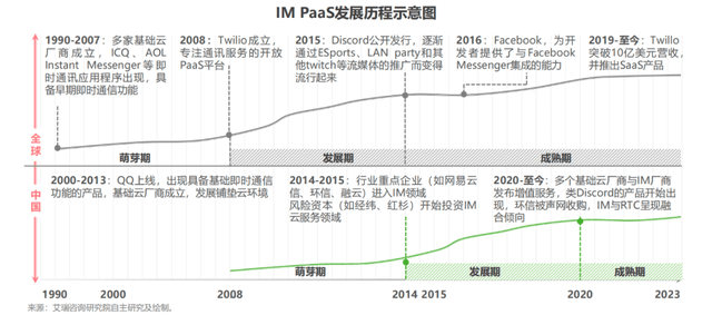 2008年,亚马逊产品经理Jeff Lawson创办了通信云平台Twilio,彼时中国IM PaaS还处在萌芽期。2014年前后中国涌现出多家IM PaaS玩家,网易云信、融云、即构等玩家浮出水面,并迎来红杉、经纬等头部VC押注。看到专业IM PaaS风生水起后,腾讯云等基础云服务商陆续发布相应产品,RTC云通信服务商声网则在2021年收购了环信。