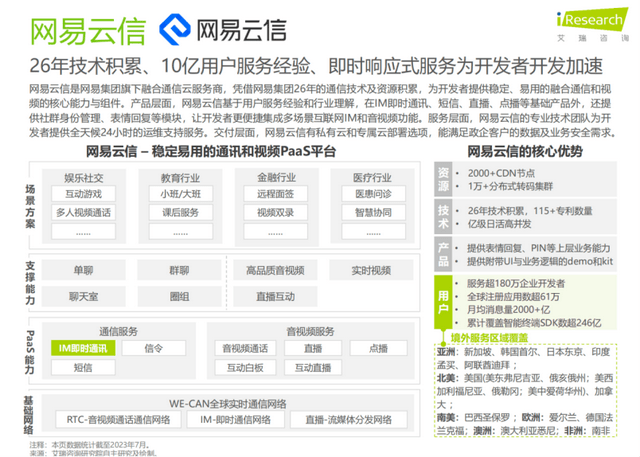 艾瑞报告显示,网易云信于2015年正式成立,至今已服务超过 180 万企业开发者,全球注册应用数超过 61 万,累计覆盖智能终端 SDK 数 246 亿。目前,网易云信月均消息量达到 2000 亿,在 IM PaaS 服务提供商中位居行业第一阵营。IM PaaS最核心的服务就是收发消息,月均消息量是服务规模最直观的量化体现,从月均消息量2000亿来看,网易云信是实打实的IM PaaS头部玩家。