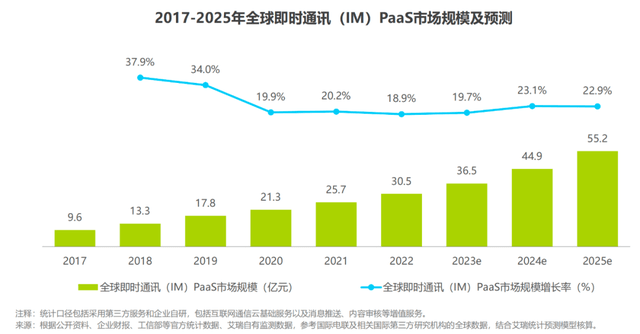 近日,艾瑞咨询发布《2023年全球即时通讯(IM)PaaS市场洞察白皮书》(下文简称《白皮书》)。《白皮书》显示,2022年全球即时通讯(IM)PaaS市场规模为30.5亿元,同比增长18.9%。在可见的未来,全球 IM PaaS 市场将稳定增长,随着 ChatGPT 兴起带动大语言模型与即时通讯类产品结合, IM PaaS 厂商有望通过与大模型集成进一步帮助企业客户拓宽应用场景。预计到 2025 年,全球 IM PaaS 市场规模将增长至 55.2 亿元。