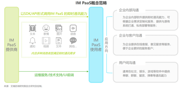 IM即“即时通信”的英文单词缩写,IM PaaS服务可让开发者以SDK/API形式调用并集成IM能力到应用中,包括消息传输、群组管理、会话管理等通讯能力,其中消息类型包括文字、表情、图片、语音、视频、文件、通知等。除了底层IM通信能力外,IM PaaS还延展出了内容审核、音视频实时通信、场景化服务等上层服务,更好地满足开发者的相关需求。