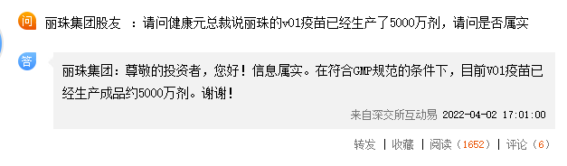 对于新冠疫苗的库存数量丽珠集团并未给出具体数据,不过去年4月,在投资者互动平台上,丽珠集团曾表示,“在复核GMP规范的条件下,目前V-01疫苗已经生产成品约5000万剂。”