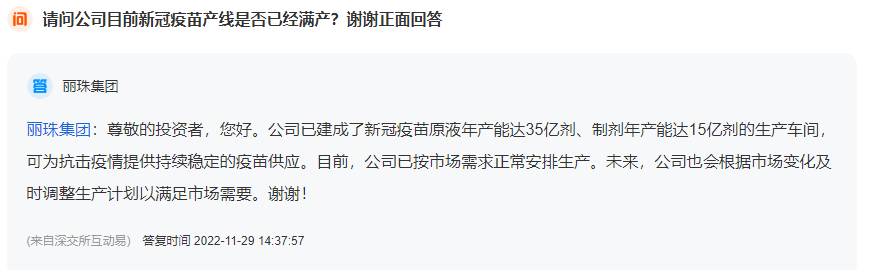 而产能方面,在去年11月,同样在投资者互动平台上,丽珠集团表示已建成了新冠疫苗原液年产能达35亿剂、制剂年产能达15亿剂的生产车间。