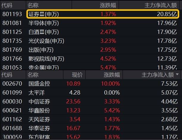 主力资金也回来了,申万二级证券板块今日重获主力资金净买入20.85亿元,位居所有申万二级行业首位,国盛金控、太平洋、中信证券等多股单日获增仓超亿元。