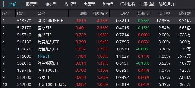 代表ETF方面,科技ETF(515000)全天高开高走,场内价格盘中涨超2.5%,收盘仍有1.63%的涨幅,收复5日均线!另外,该ETF权重股恒瑞医药、迈瑞医疗也分别大涨4.50%、3.03%!