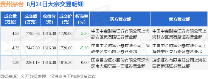 8月24日贵州茅台发生大宗交易,交易数据如下: