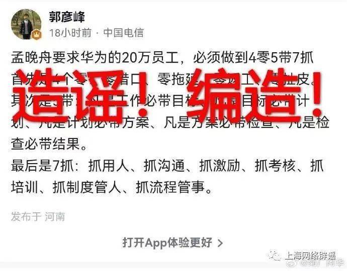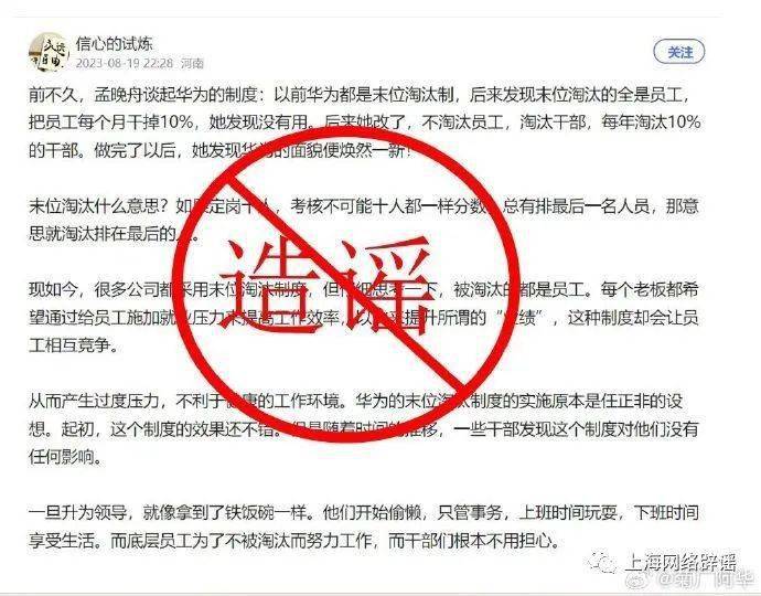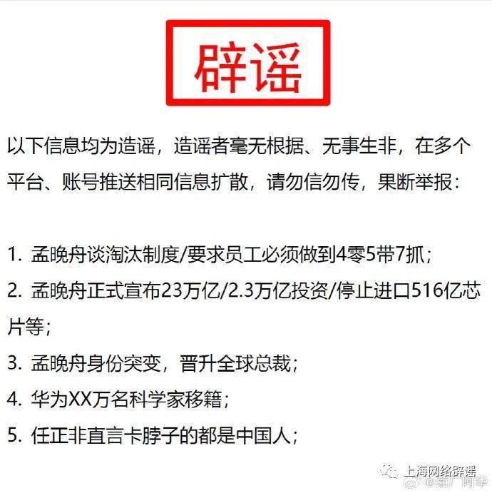 网上的言论涉及“华为3.2万名科学家正式移籍”“孟晚舟谈淘汰制度,要求员工必须做到4零5带7抓”“孟晚舟正式宣布23万亿/2.3万亿投资,停止进口516亿芯片”“孟晚舟身份突变,晋升全球总裁”“任正非直言卡中国芯片脖子的都是自己人”等。