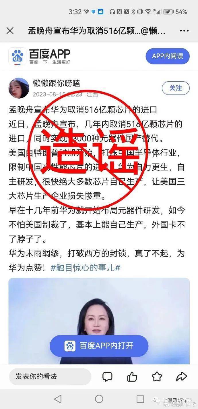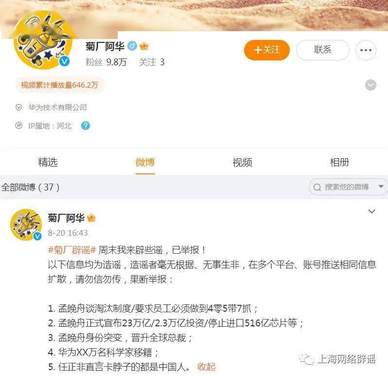 8月20日,华为技术有限公司认证的官方账号“@菊厂阿华”通过微博辟谣,以上信息均为造谣,并呼吁各位网友勿信勿传,果断举报。
