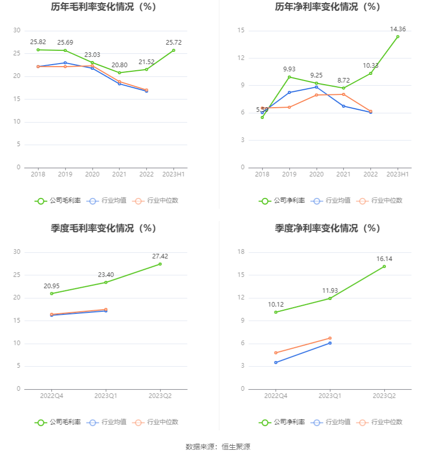 2023年上半年,公司毛利率为25.72%,同比上升3.70个百分点;净利率为14.36%,较上年同期上升3.86个百分点。从单季度指标来看,2023年第二季度公司毛利率为27.42%,同比上升5.22个百分点,环比上升4.02个百分点;净利率为16.14%,较上年同期上升6.09个百分点,较上一季度上升4.21个百分点。
