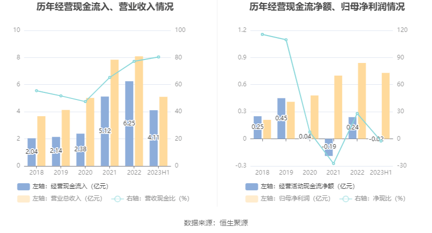 2023年上半年,公司营业收入现金比为80.43%,净现比为-2.48%。