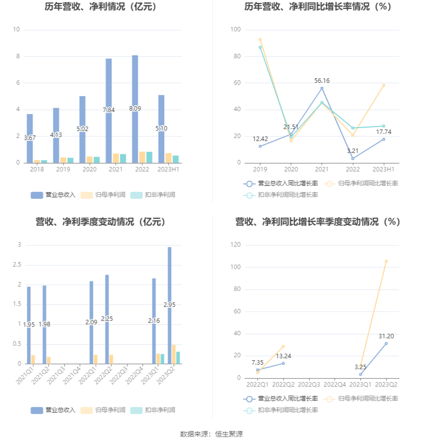 根据半年报,公司第二季度实现营业总收入2.95亿元,同比增长31.20%,环比增长36.73%;归母净利润4758.67万元,同比增长105.43%,环比增长85.02%;扣非净利润3058.75万元,环比增长24.09%。