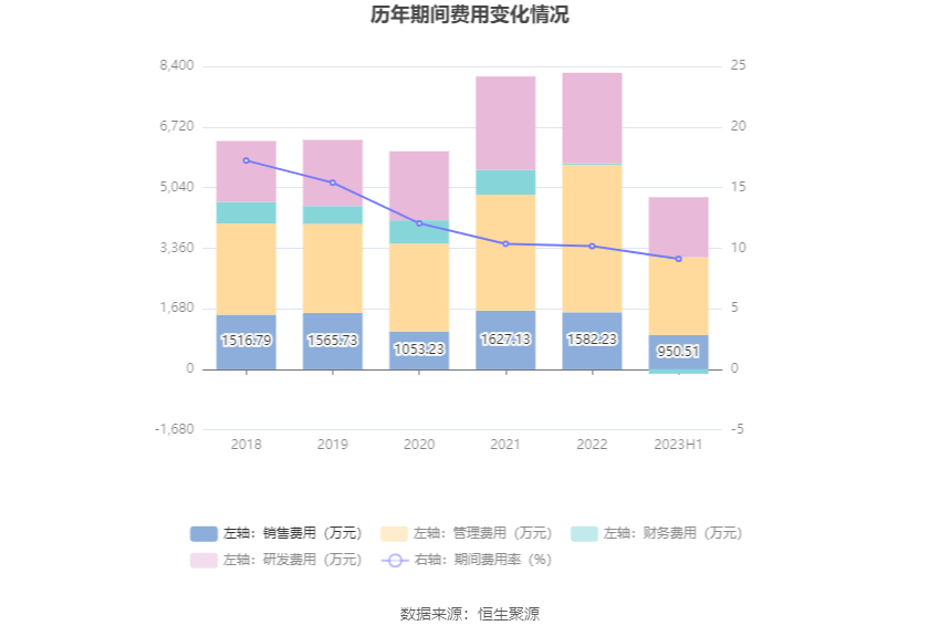 2023年上半年,公司期间费用为4651.51万元,较上年同期增加316.71万元;但期间费用率为9.11%,较上年同期下降0.89个百分点。其中,销售费用同比增长9.23%,管理费用同比增长13.76%,研发费用同比增长8.17%,财务费用由去年同期的28.12万元变为-122.09万元。