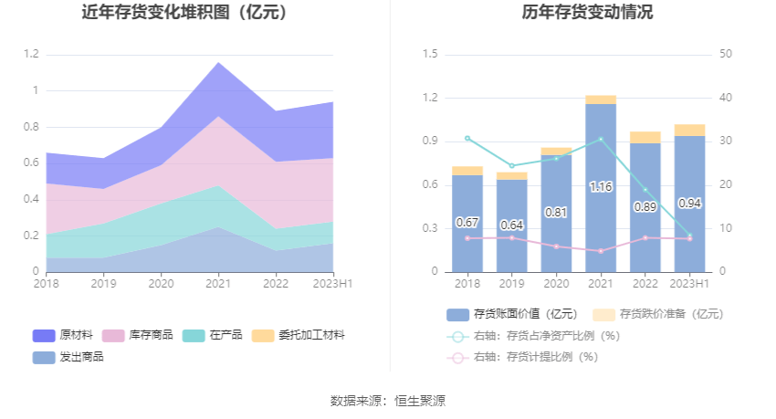 从存货变动来看,截至2023年上半年末,公司存货账面价值为9385.49万元,占净资产的8.52%,较上年末增加498.67万元。其中,存货跌价准备为784.03万元,计提比例为7.71%。