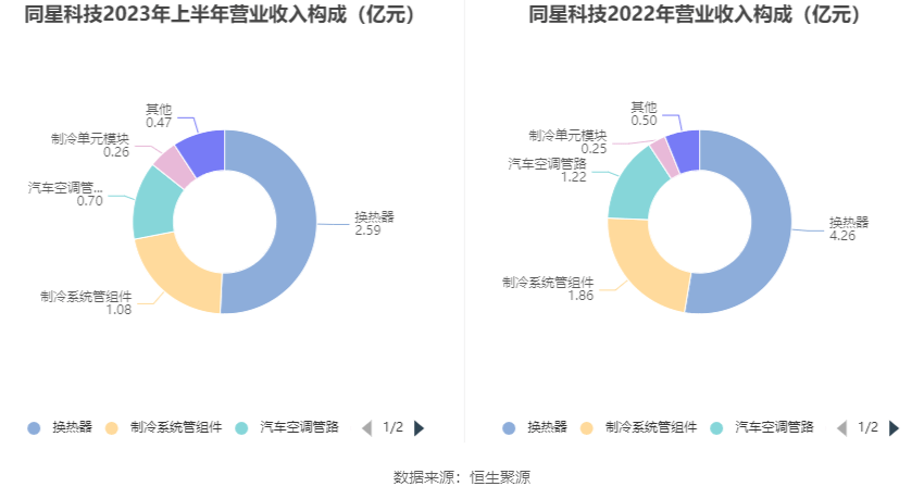 分产品看,换热器、制冷系统管组件、汽车空调管路2023年上半年毛利率分别为24.18%、30.23%、9.63%。