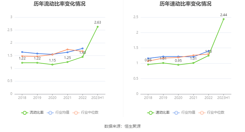 2023年上半年,公司流动比率为2.63,速动比率为2.44。