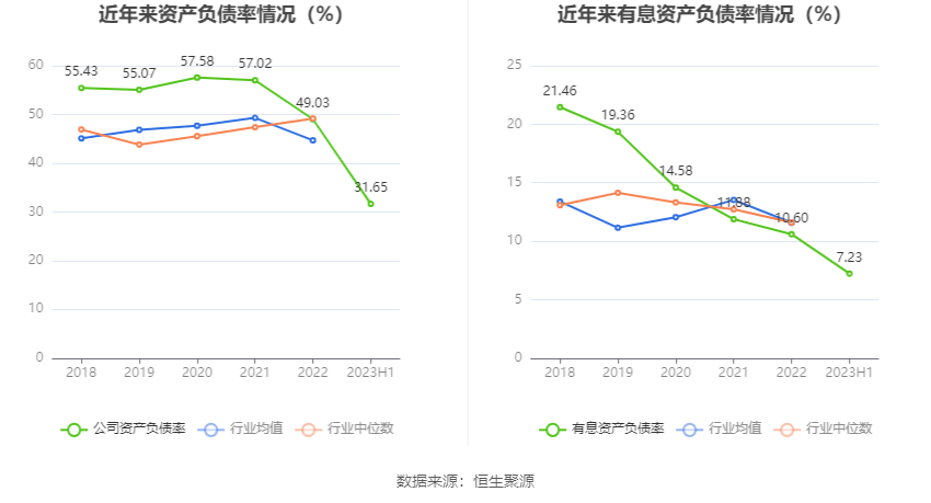 偿债能力方面,公司2023年二季度末资产负债率为31.65%,相比上年末减少17.38个百分点;有息资产负债率为7.23%,相比上年末减少3.37个百分点。