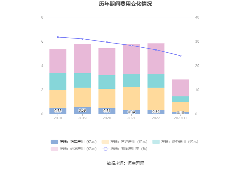2023年上半年,公司期间费用为2.87亿元,较上年同期减少1673.29万元;期间费用率为24.25%,较上年同期下降3.37个百分点。其中,销售费用同比下降13.39%,管理费用同比增长4.26%,研发费用同比下降5.9%,财务费用同比下降15.96%。