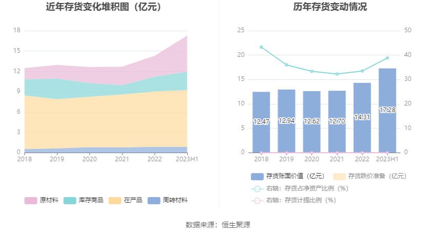 从存货变动来看,截至2023年上半年末,公司存货账面价值为17.28亿元,占净资产的38.86%,较上年末增加2.98亿元。根据财报,公司本期没有计提存货跌价准备。