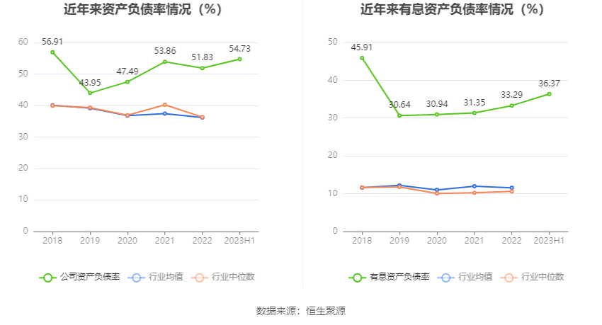 偿债能力方面,公司2023年二季度末资产负债率为54.73%,相比上年末增加2.90个百分点;有息资产负债率为36.37%,相比上年末增加3.08个百分点。