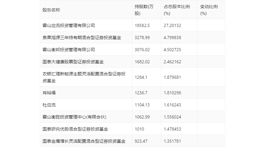 半年报显示,2023年上半年末的公司十大流通股东中,持股最多的为霍山应流投资管理有限公司,占比27.20%。十大流通股东名单相比2023年一季报维持不变。在具体持股比例上,泉果旭源三年持有期混合型证券投资基金、杜应流、国泰研究优势混合型证券投资基金、国泰金鹰增长灵活配置混合型证券投资基金持股有所上升,国泰大健康股票型证券投资基金持股有所下降。