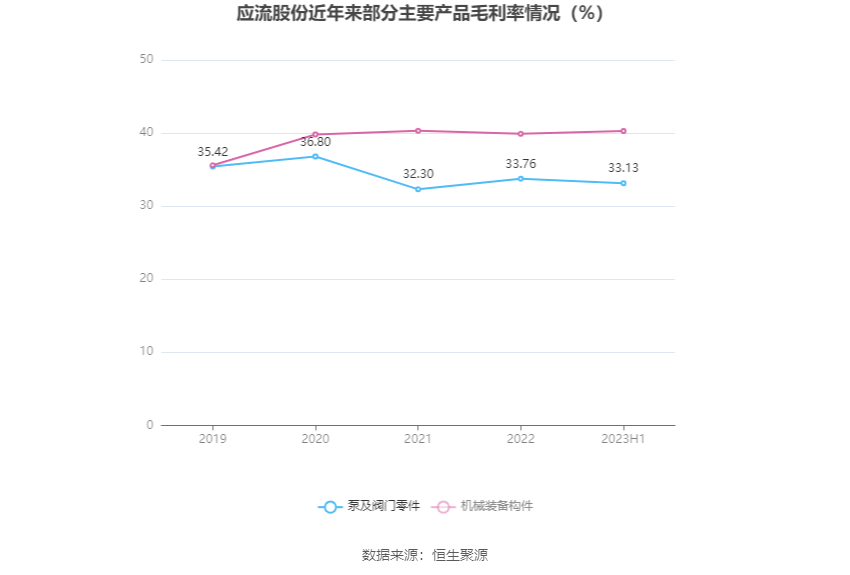 分产品看,泵及阀门零件、机械装备构件2023年上半年毛利率分别为33.13%、40.28%。其中,泵及阀门零件连续3年下降。