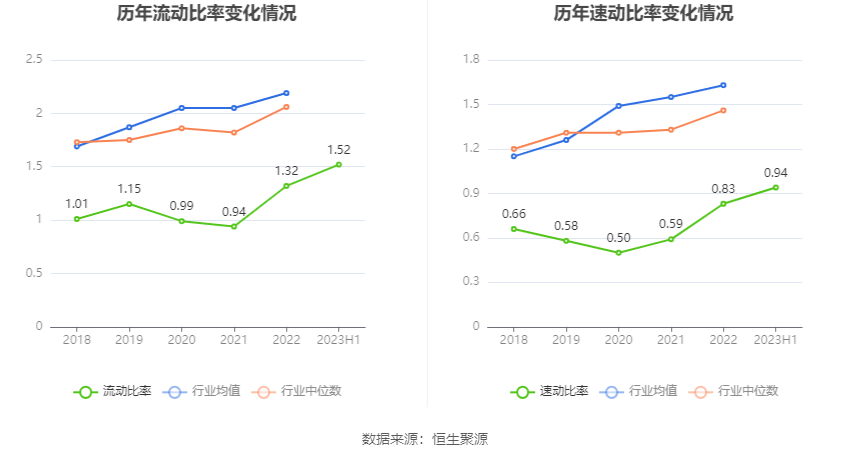 2023年上半年,公司流动比率为1.52,速动比率为0.94。